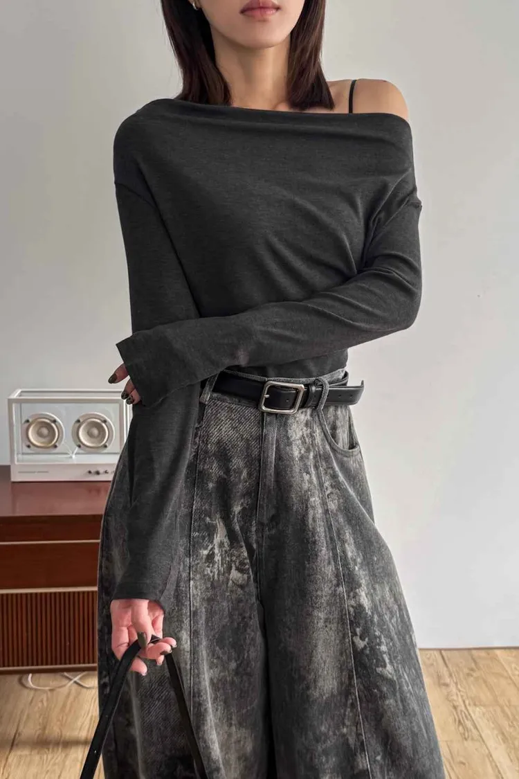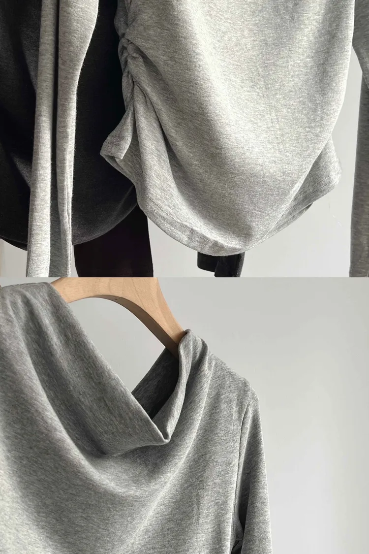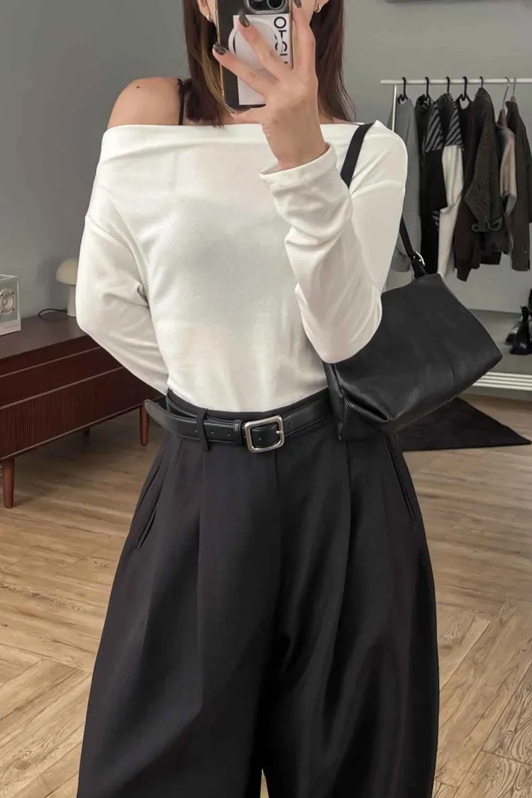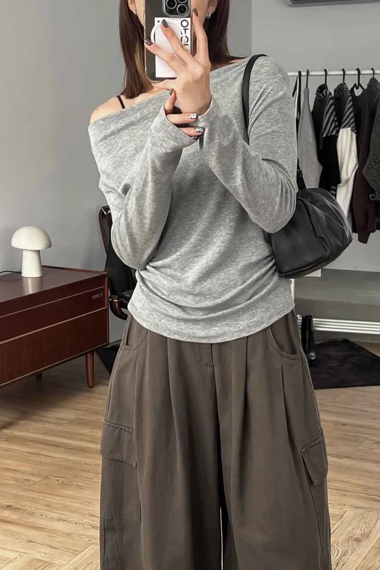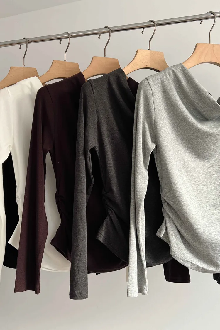 _D16. 超舒服.彈力斜肩縮邊上衣