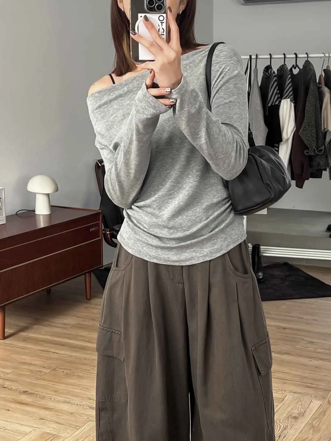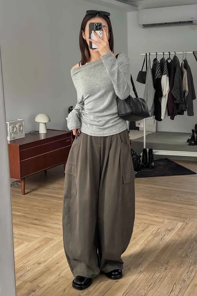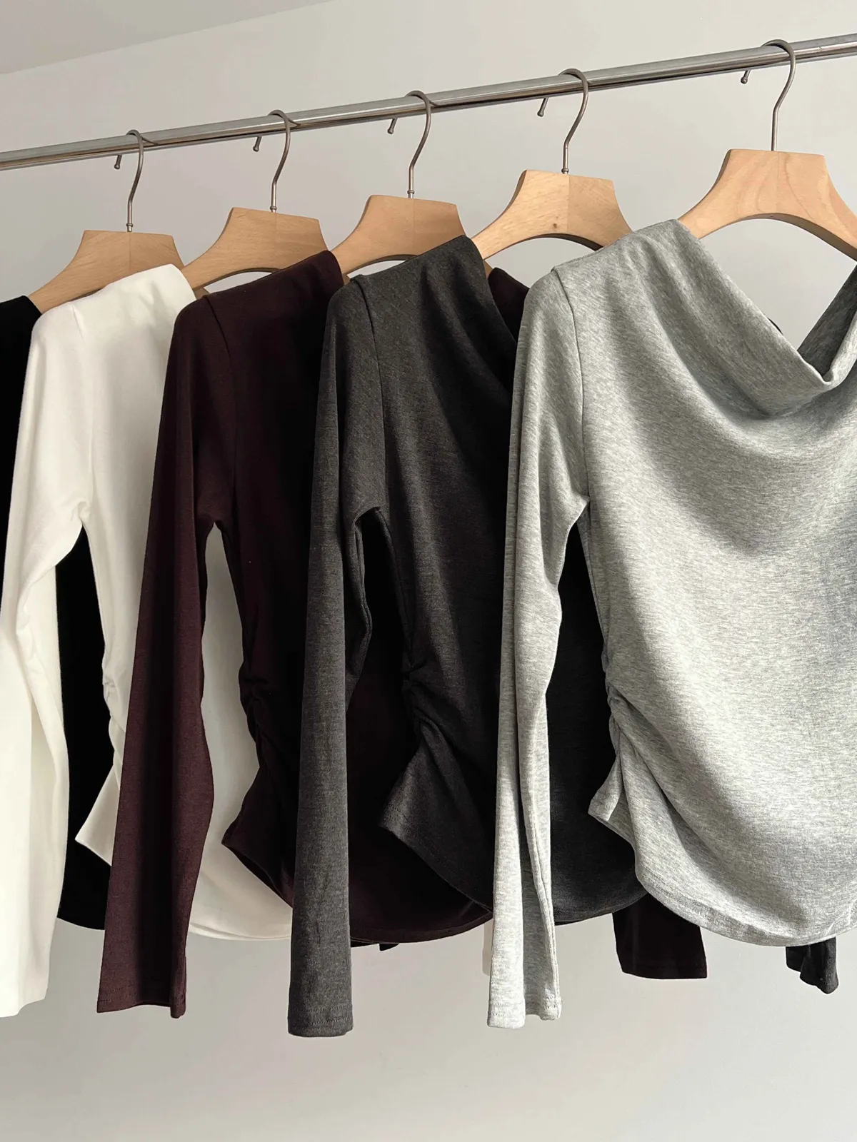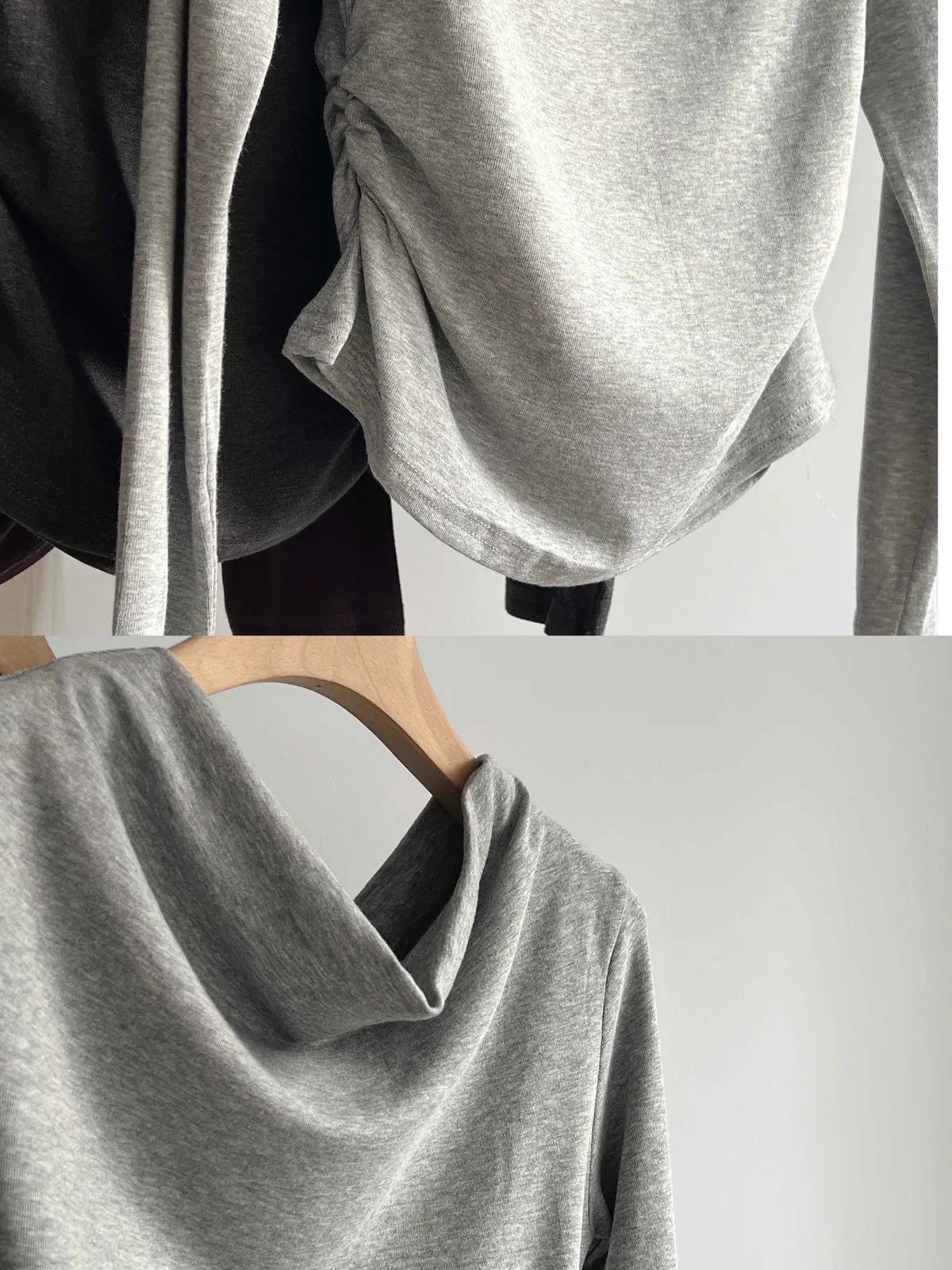 _D16. 超舒服.彈力斜肩縮邊上衣