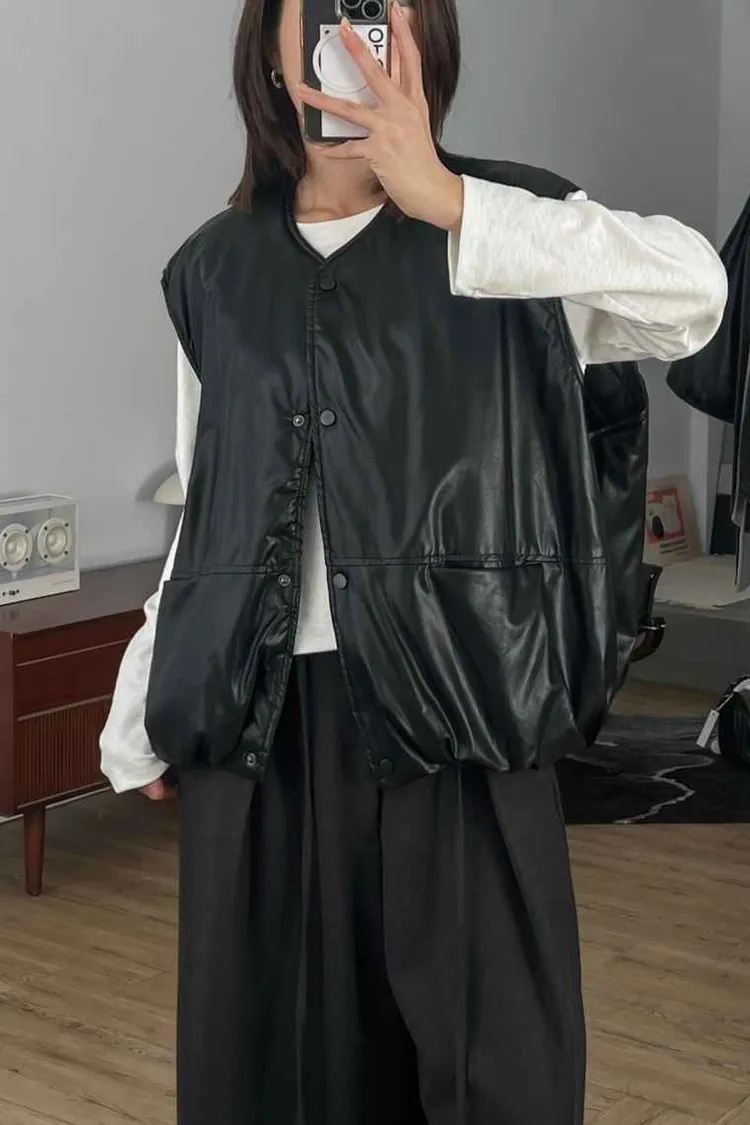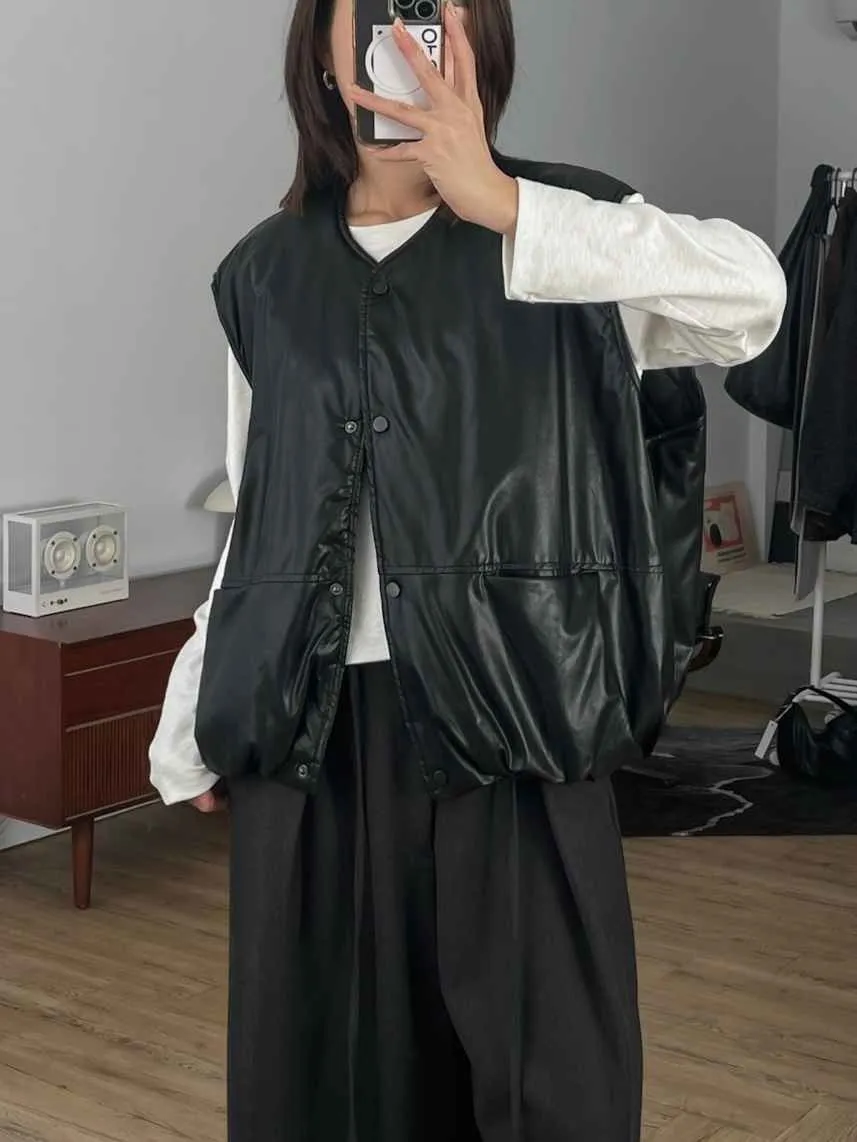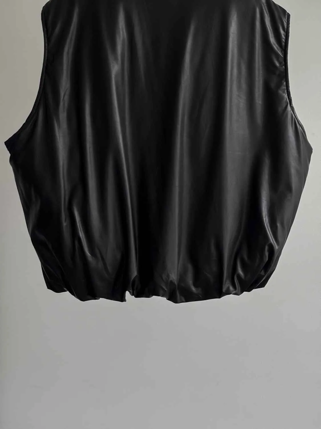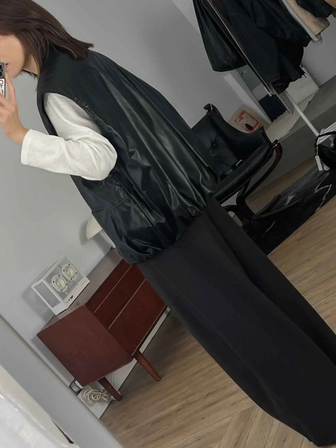 _F20.超輕量.黑色夾棉保暖皮質大背心