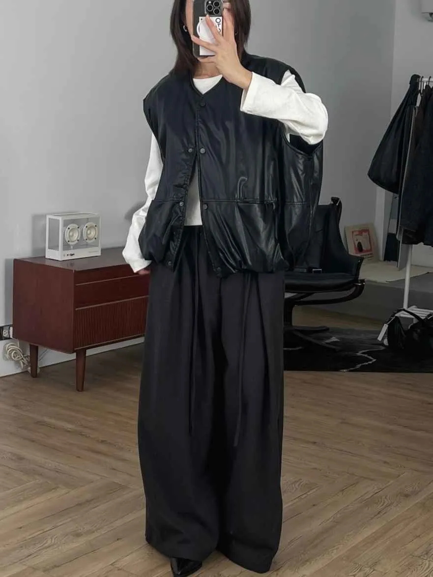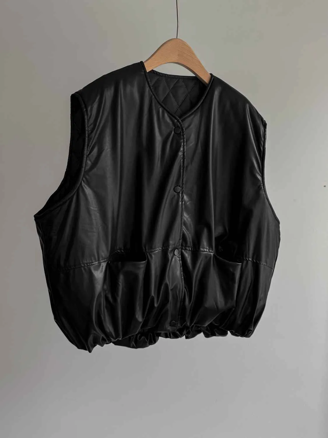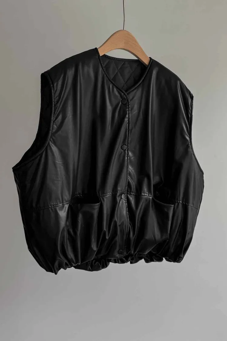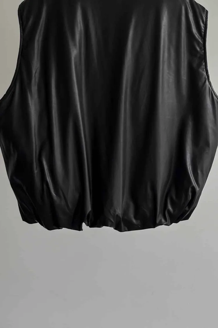 _F20.超輕量.黑色夾棉保暖皮質大背心